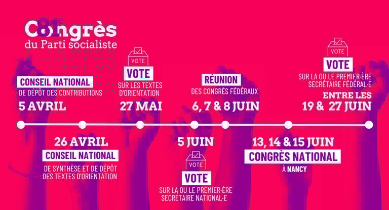 La phase de débats autour des contributions s’achèvera le 26 avril avec le conseil national de synthèse qui enregistrera les textes d’orientation, soumis aux votes des adhérent-es le 27 mai.